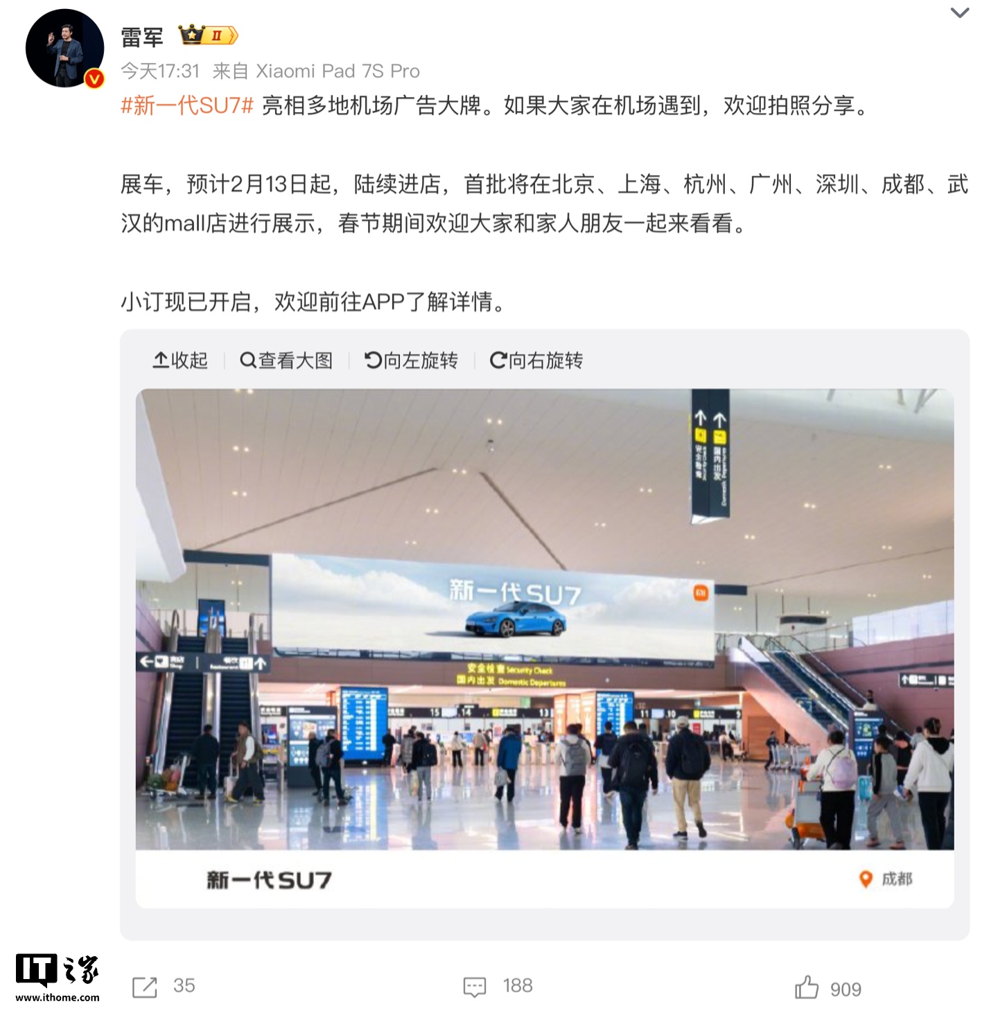 2 月 4 日消息,雷军在微博发文,透露新一代小米 SU7 已亮相多地机场广告大牌,“如果大家在机场遇到,欢迎拍照分享”,参考其照片水印,可以看出拍摄地点位于成都。