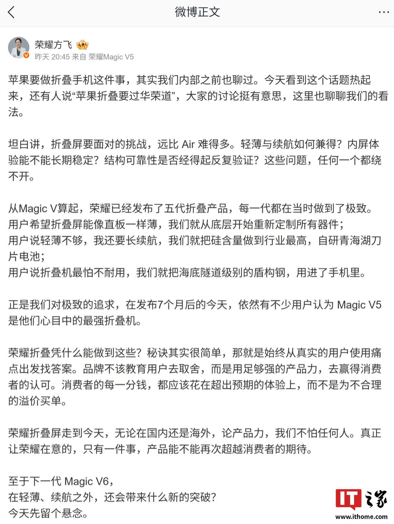 荣耀方飞谈苹果要做折叠手机,称面对的挑战远比 Air 难得多iPhone Fold荣耀方飞荣耀