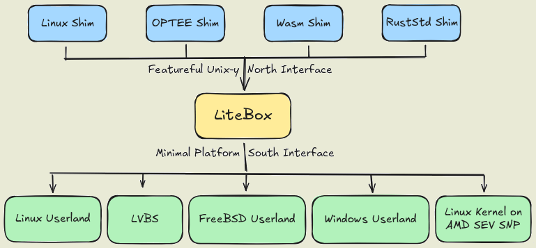 Litebox 构建了一个极简平台,负责将应用程序的请求转换为外部全功能接口可识别的指令。Litebox 目前已兼容包括 Linux 内核、OP-TEE 环境、WebAssembly 运行时以及 Rust 标准库在内的多种外部接口,为开发者提供了灵活的集成选项。