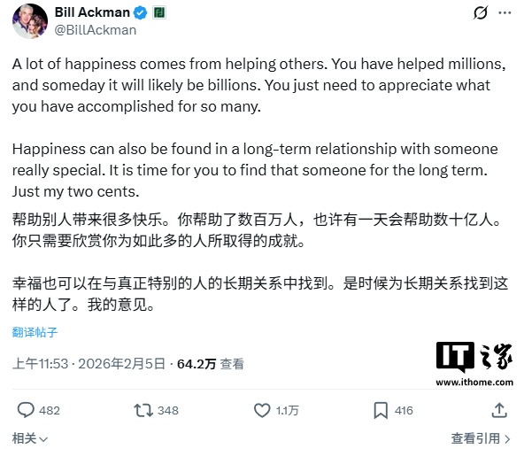 这一言论在 X 上引发了广泛的反响,其中包括一些曾面临同样困境的超级富豪。对冲基金亿万富翁比尔 · 阿克曼表示,“很多幸福都源于帮助他人。你已经帮助了数百万人,未来很可能会达到数十亿人。你只需要珍惜你为这么多人所取得的成就就好。”