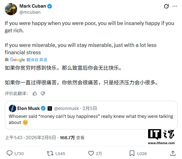 2 月 7 日消息,身价超 8000 亿美元的世界首富马斯克本周四在 X 上发帖,称“‘金钱买不到幸福’这句话真是说得太对了”,遂引发大量关注与讨论。目前这条帖子的浏览量已超过 1 亿次。
