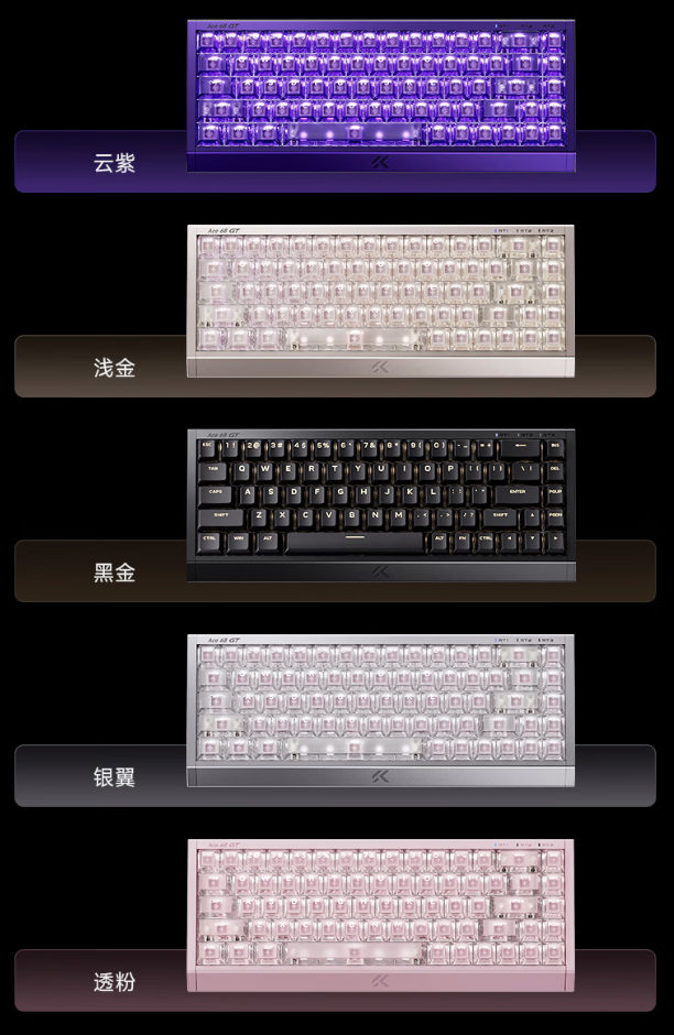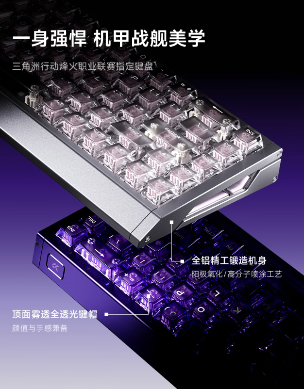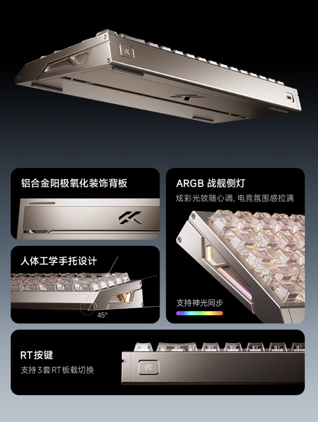 据介绍,这款键盘可选五种配色,其采用机甲战舰美学设计,使用铝合金 CNC 机身,侧面带有 RGB 氛围灯,键盘使用粉泰山磁轴 GT 轴体,匹配雾透全透光键帽,同时带有独立 RT 按键。