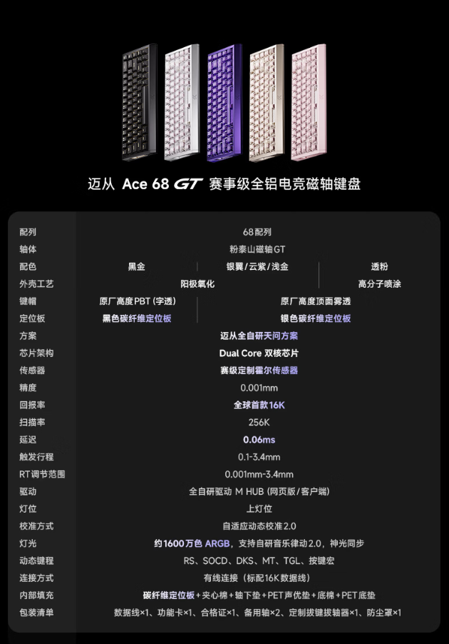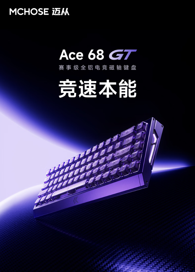 3 月 2 日消息,据迈从微博,迈从宣布推出一款 Ace 68 GT“赛事级全铝电竞磁轴键盘”,该产品主打 16K 回报率,首发价 629 元,学生价 599 元。