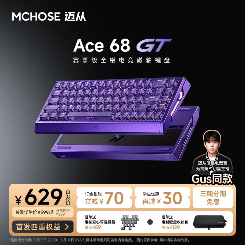 迈从 Ace 68 GT 电竞磁轴键盘采用全铝机身与自研“天问”方案,实现 0.06ms 超低延迟与 0.001mm 精度,为竞技玩家提供极致响应。首发价 629 元,学生价 599 元。#电竞外设# #机械键盘#
