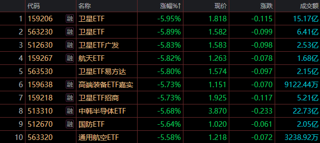 卫星ETF(159206)领跌5.95%,卫星ETF(563230)跌5.89%,卫星ETF广发(512630)跌5.83%。