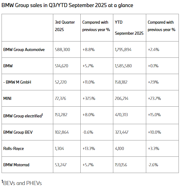 劳斯莱斯(Rolls-Royce)品牌在前九个月共交付 4,100 辆汽车,同比增加 3.3%。此外,宝马摩托车部门同期共交付 159,156 辆摩托车与踏板车,同比下降 2.6%;但第三季度实现回升,交付 53,247 辆,同比增长 5.7%。