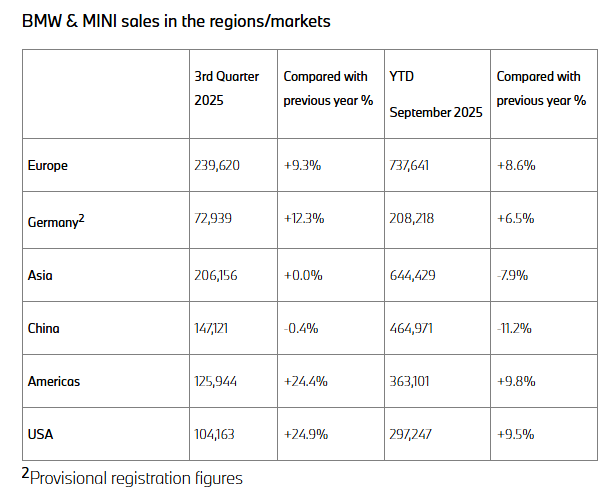 宝马集团 2025 年第三季度交付 58.83 万辆同比增长 8.8%,在华销量 147121 辆同比降低 0.4%宝马集团新能源车型