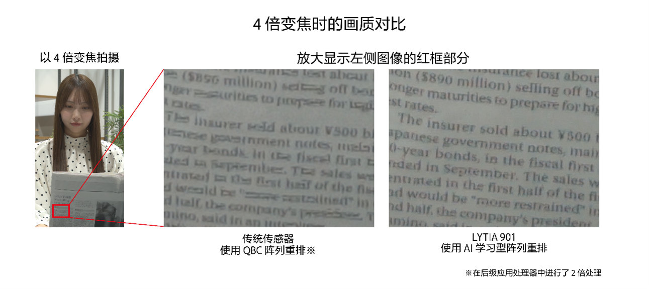 索尼在 LYTIA 901 中开发了适配 QQBC 排列的 AI 学习型阵列重排,并将其处理电路集成于传感器内部。AI 学习型阵列重排可用于传统方式难以再现的高频成分的信号处理,在精细图案、文字等微观细节表现上呈现更高的还原能力。同时,该技术的片上集成还使高速处理成为可能,从而支持在 4K 分辨率下在最高 4 倍变焦下进行 30fps 高画质视频拍摄。