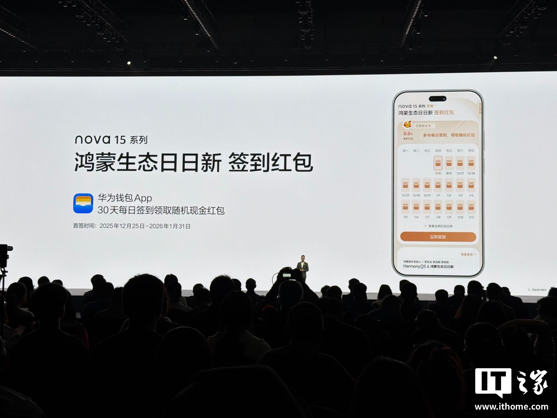 从华为 nova 15 系列及全场景新品发布会现场获悉,nova 15 系列手机支持生态日日新签到红包,用户可在华为钱包 App 每天领取随机现金红包(可签到 30 天)。