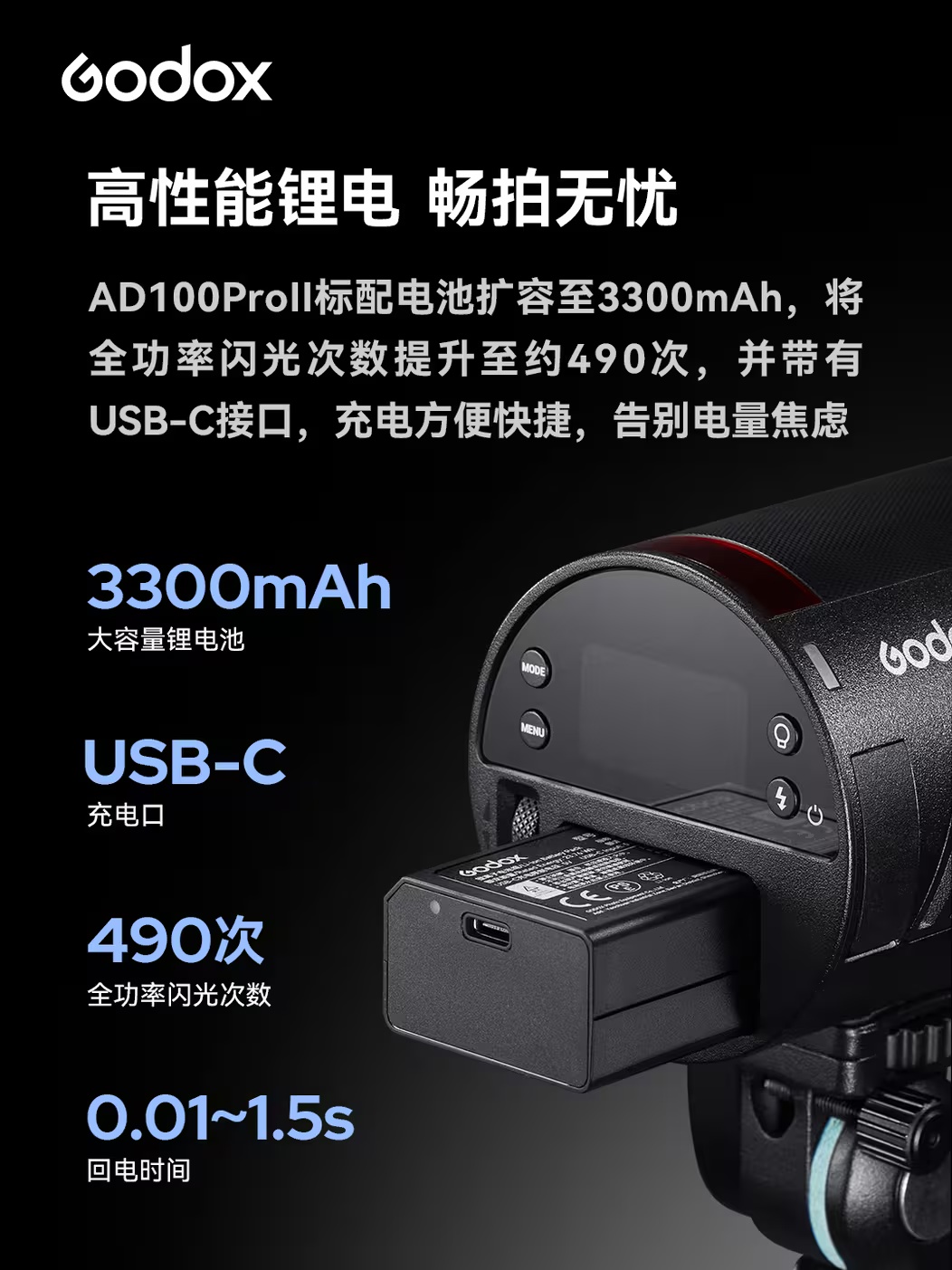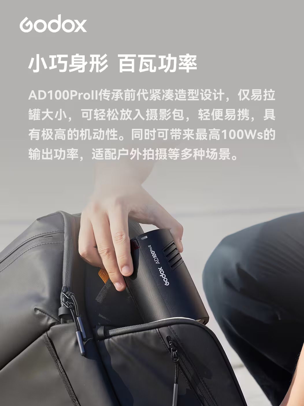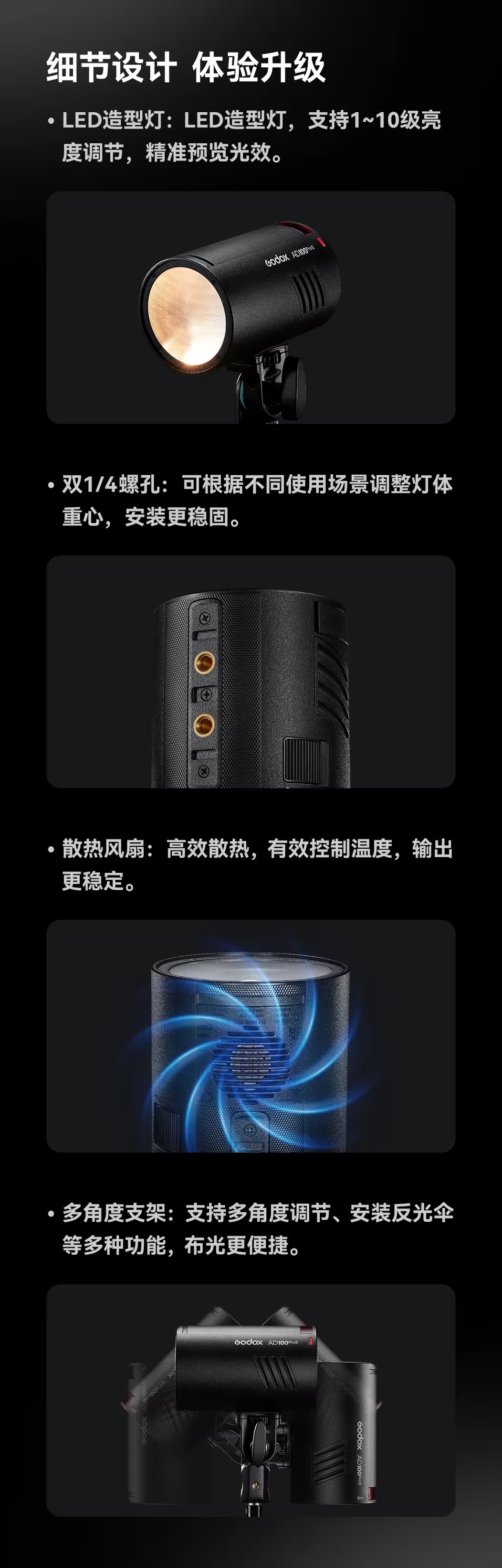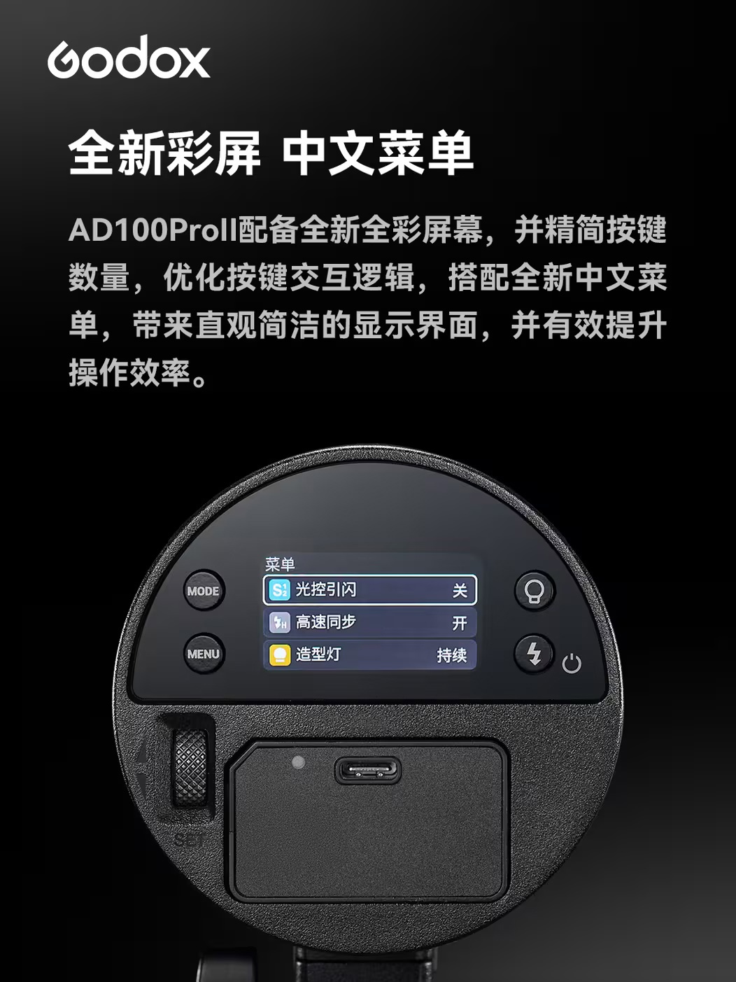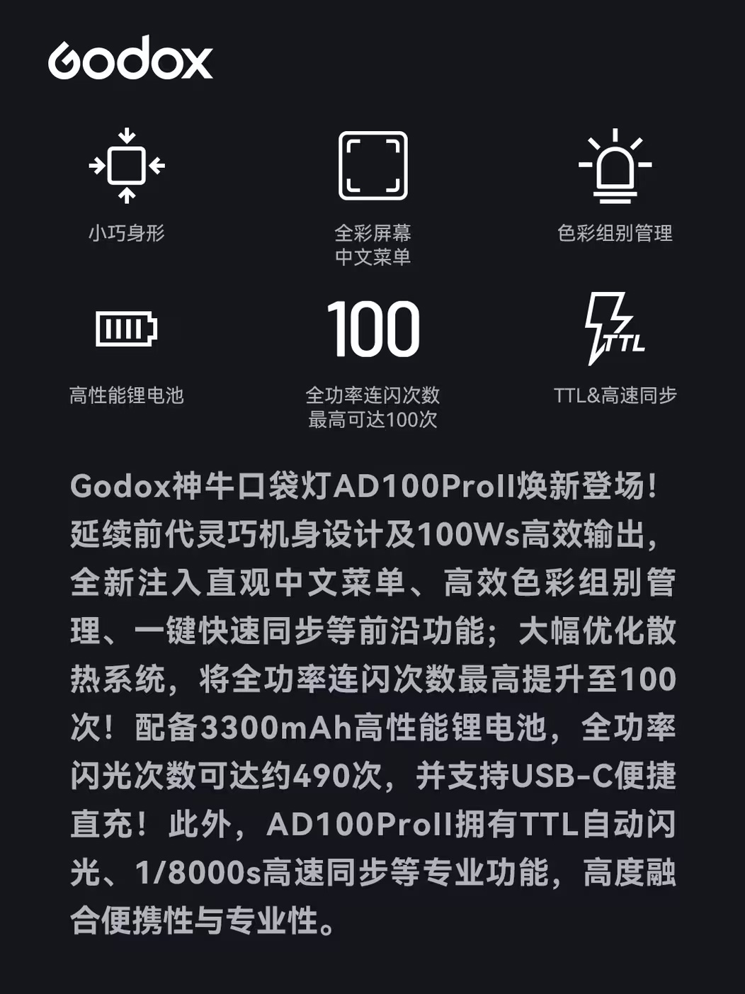 神牛发布AD100 Pro II闪光灯,主打小巧便携与高效散热,全功率连闪次数最高可达100次,配备中文菜单与全彩屏幕,售价1580元。 #摄影器材##闪光灯#