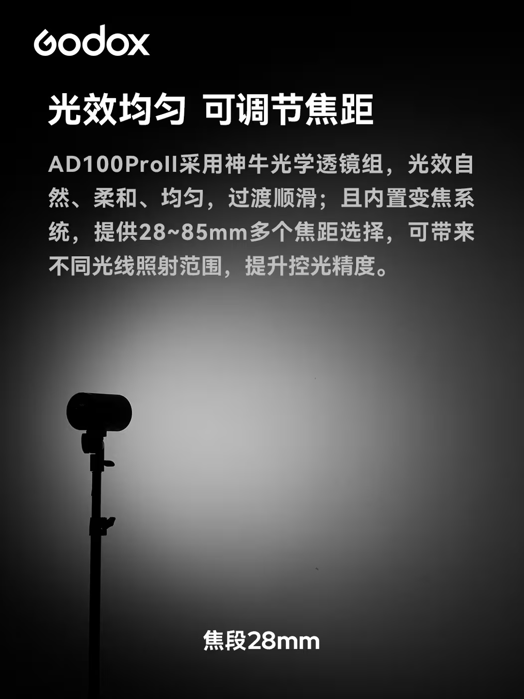 设计方面,这款闪光灯配备全彩屏幕,相比前代产品 AD 100 Pro 精简了按键数量,优化按键交互逻辑,拥有全新中文菜单,可带来简洁直观的显示界面,采用神牛光学透镜组,内置变焦系统,提供 28-85mm 多个焦段选择,覆盖不同光线照射范围。