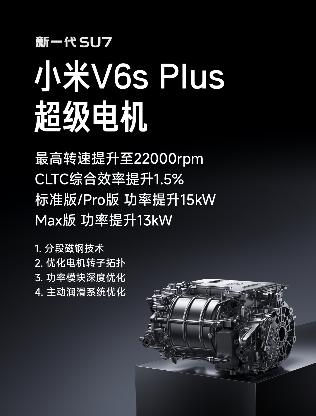 新一代 SU7 搭载的小米 V6s Plus 超级电机有着四项重要升级:首先通过「电机转子拓扑优化」提升转速耐受性,可将电机最高转速提升至 22000rpm,我们还通过「分段磁钢」技术减少涡流损耗、「功率模块深度优化」提高电能转换效率、「主动润滑系统优化」降低机械阻力。与第一代 SU7 搭载的 V6s 超级电机相比,V6s Plus 超级电机的 CLTC 工况效率提升了 1.5%,同等电量下可增加超过十公里的续航里程。新一代小米 SU7 全系标配的小米 V6s Plus 超级电机,此前已在小米 YU7 车型上历经过充分验证,并收获了用户的广泛好评。我们将持续投入,深耕核心技术,持续优化用户体验。