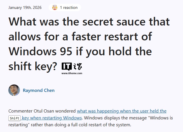 微软工程师揭秘 Win95 特殊机制:按住 Shift 重启可实现“伪快速启动”,一个失败但超前的 Windows 设计微软Raymond Chen快速启动Windows 95