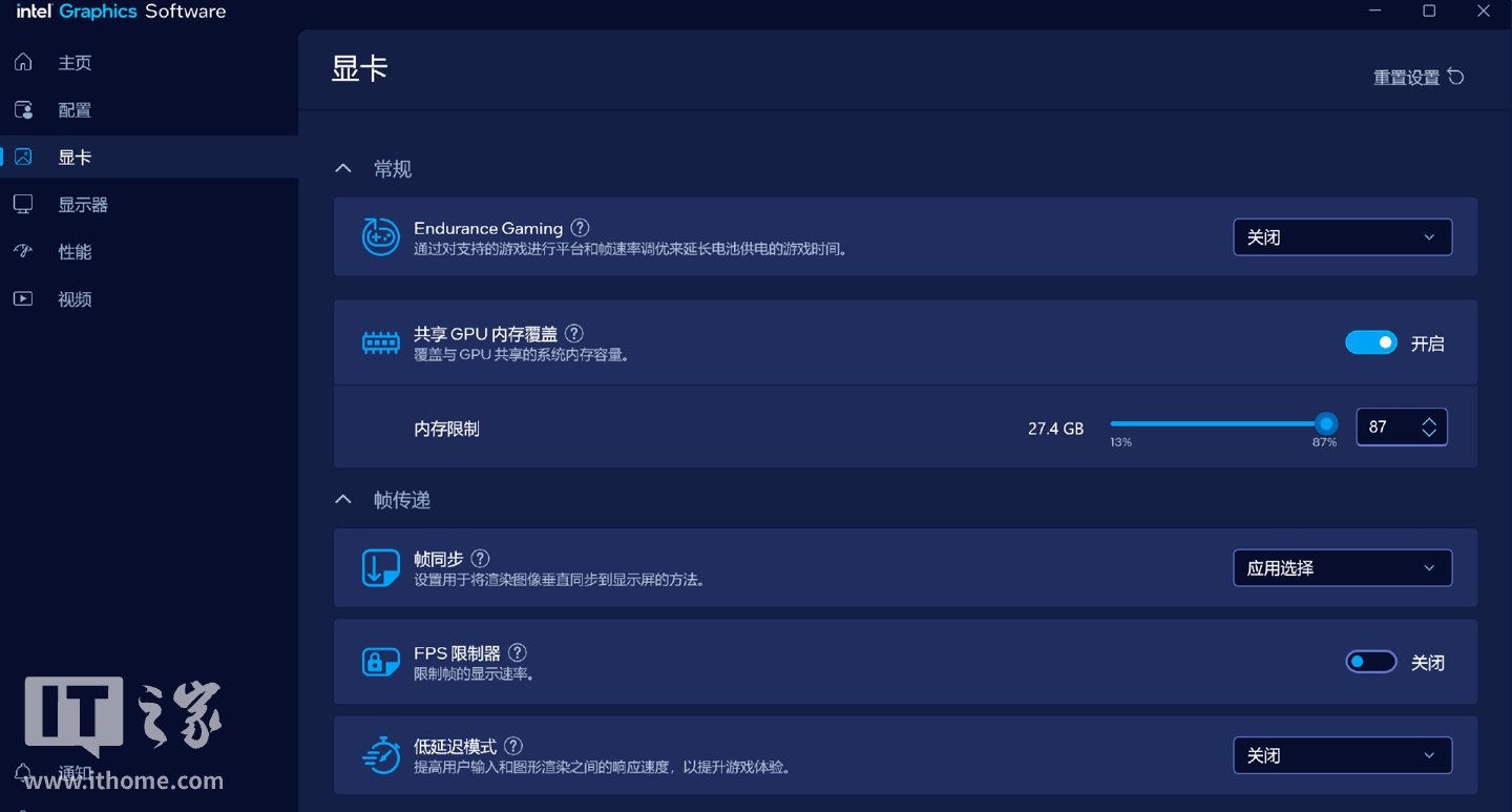 在本次测试的 32GB 内存机型上,系统最多可将 87% 的容量(约 27.3GB)共享给锐炫核显。