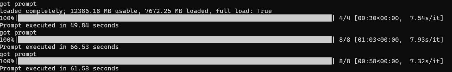 如下图所示,三次文生图分别耗时 1 分 29 秒、1 分 29 秒和 2 分 07 秒。