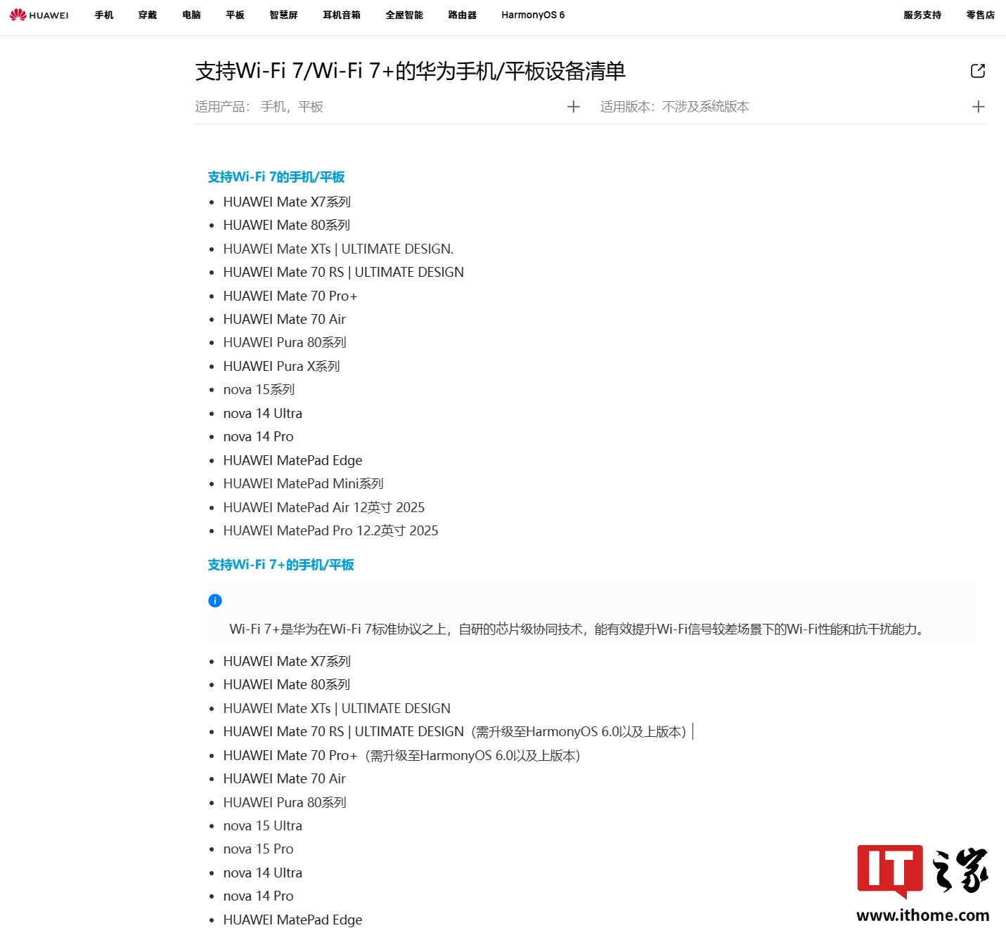 附支持 Wi-Fi 7 / Wi-Fi 7+ 的华为手机 / 平板设备清单如下(据介绍,Wi-Fi 7+ 是华为在 Wi-Fi 7 标准协议之上,自研的芯片级协同技术,能提升 Wi-Fi 信号较差场景下的 Wi-Fi 性能和抗干扰能力):