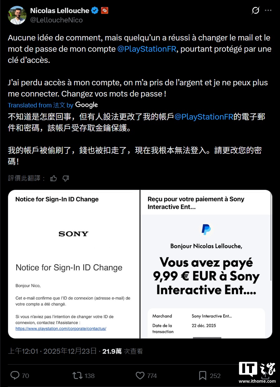 12 月 23 日消息,法国媒体 Numerama 记者 Nicolas Lellouche 昨天在 X 平台发文称,他的索尼 PlayStation Network 账号遭到了黑客入侵,即使他开启了通行密钥,平时只使用苹果 的 FaceID 登录账号。