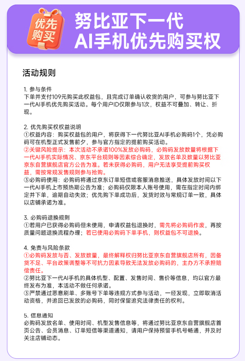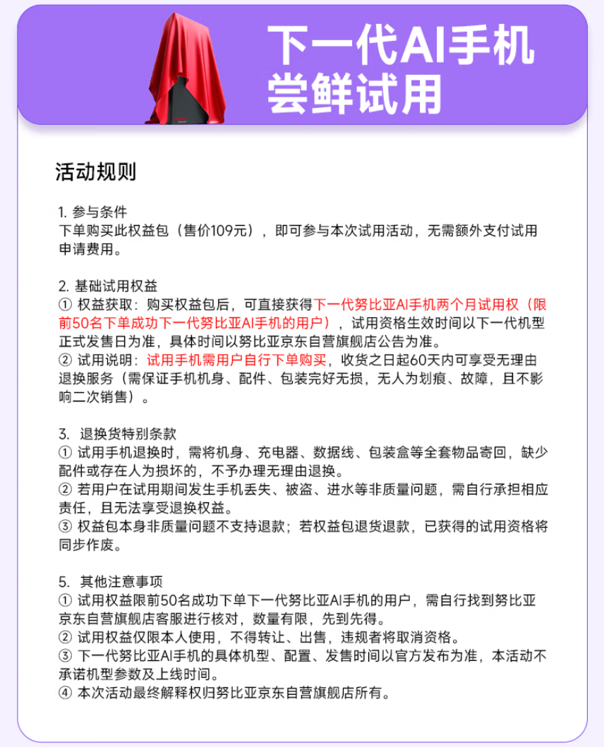努比亚手机京东自营旗舰店上架了名为「先尝甜豆 AI 包」的商品,商品详情页显示,其为一款权益包,支持购买的用户尝鲜试用、优先购买下一代 AI 手机等,定价 109 元(目前已下架)。