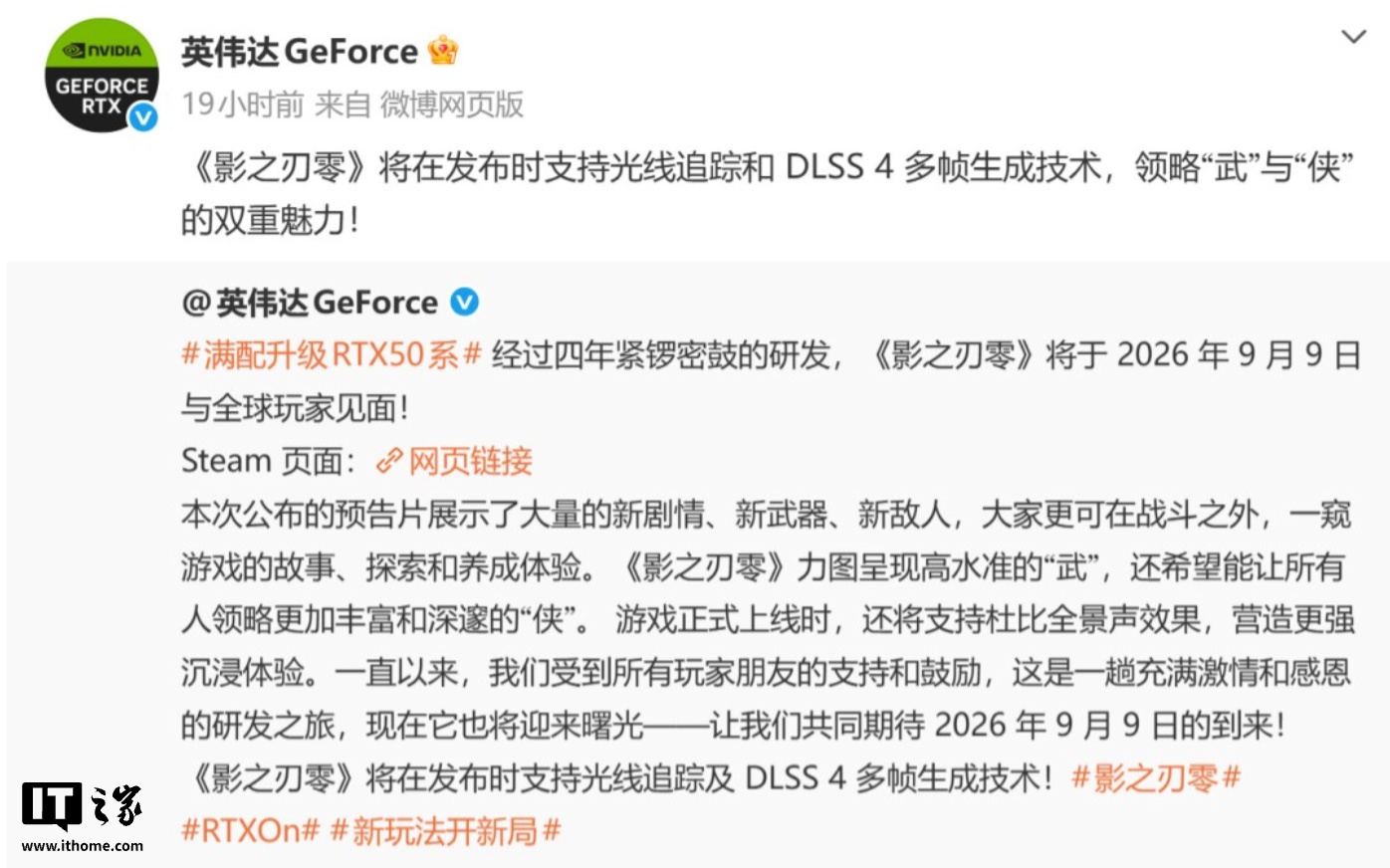 12 月 24 日消息,英伟达官方微博宣布国产大作《影之刃零》首发支持光线追踪及 DLSS 4 多帧生成技术,游戏将于 2026 年 9 月 9 日正式发售。