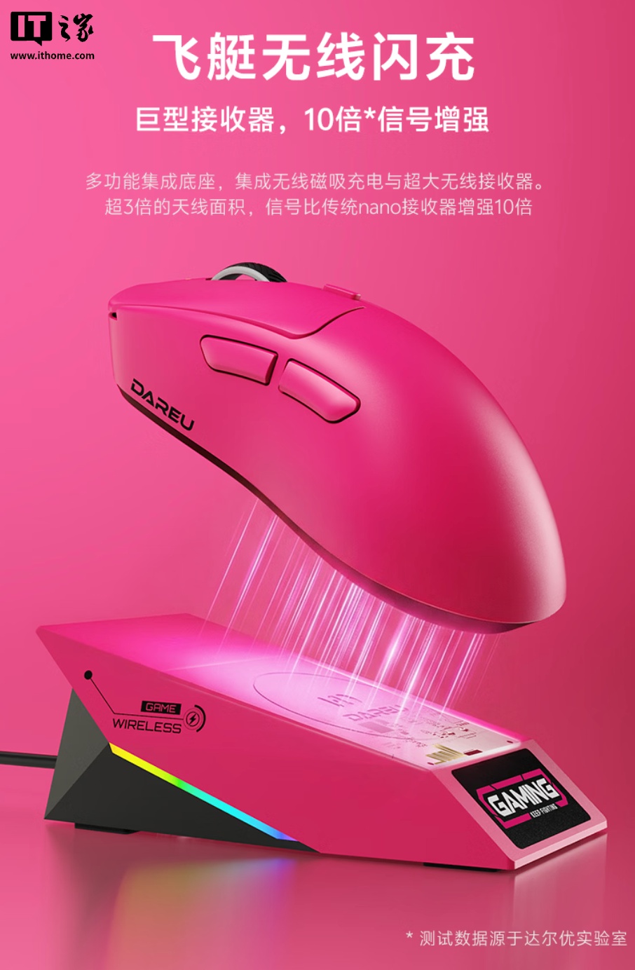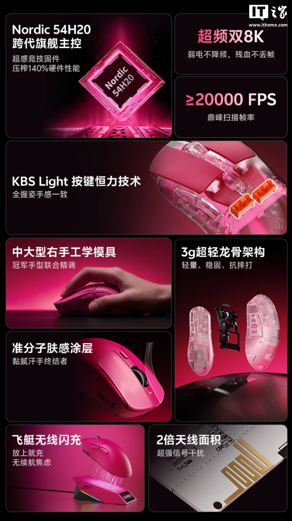 该鼠标使用 Nordic 54H20 主控及欧姆龙 1 亿寿命机械微动,提供双 8K 回报率及至高 42000 DPI,内置 500 毫安时电池,续航至高可达 222 小时,可放置于“飞艇无线闪充”接收器上无线充电。