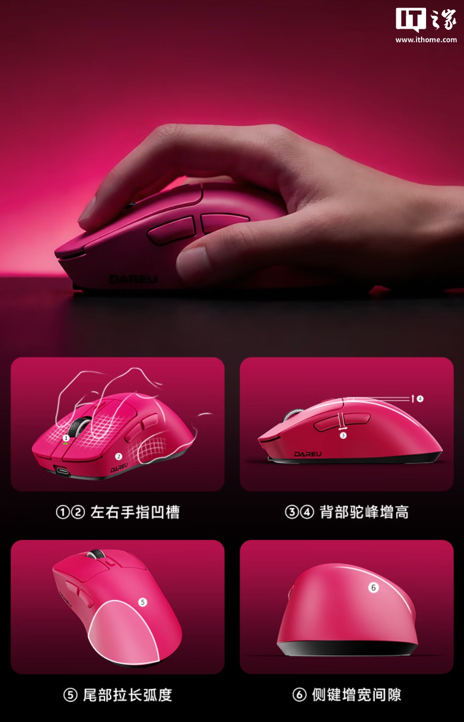 该鼠标可选白蓝、洋红两种配色,整体尺寸 125.6 x 67.6 x 44.3mm,使用中大型右手工学模具,带有准分子肤感涂层,龙骨重量 3g,整体重量约 70g。