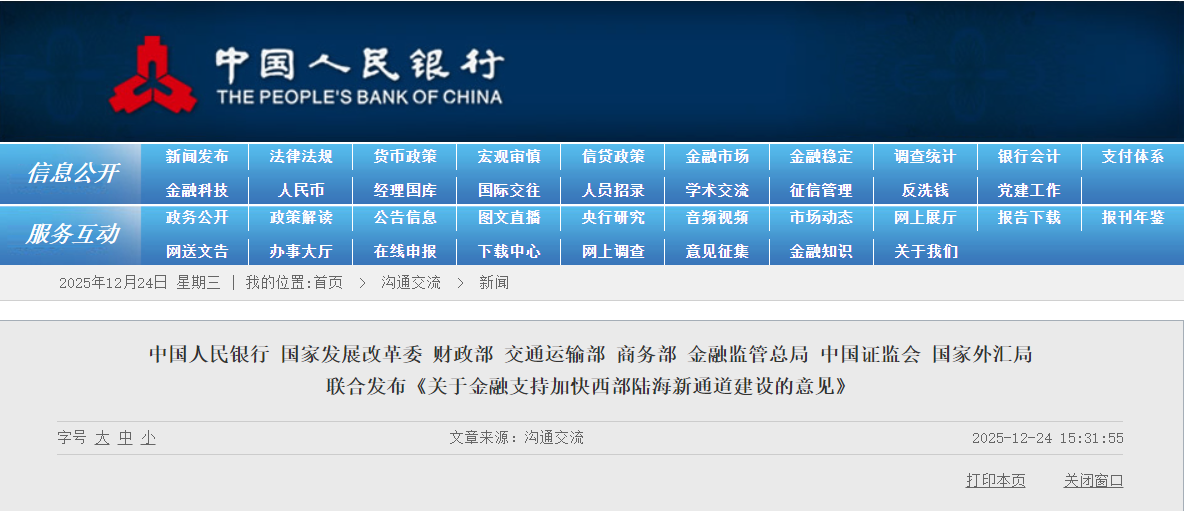 12 月 24 日消息,中国人民银行、国家发展改革委、财政部、交通运输部、商务部、金融监管总局、中国证监会、国家外汇局今日联合印发《关于金融支持加快西部陆海新通道建设的意见》(以下简称《意见》)。