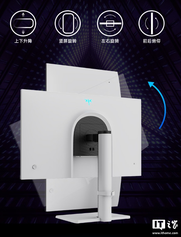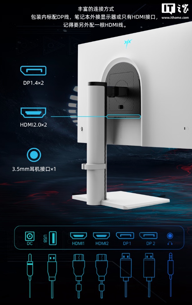 该机支架支持升降 / 倾斜 / 旋转,显示器本体支持 VESA 壁挂,带有扬声器(具体信息未公布),提供 2 个 DP 1.4、2 个 HDMI 2.0、1 个 3.5mm 音频接口。