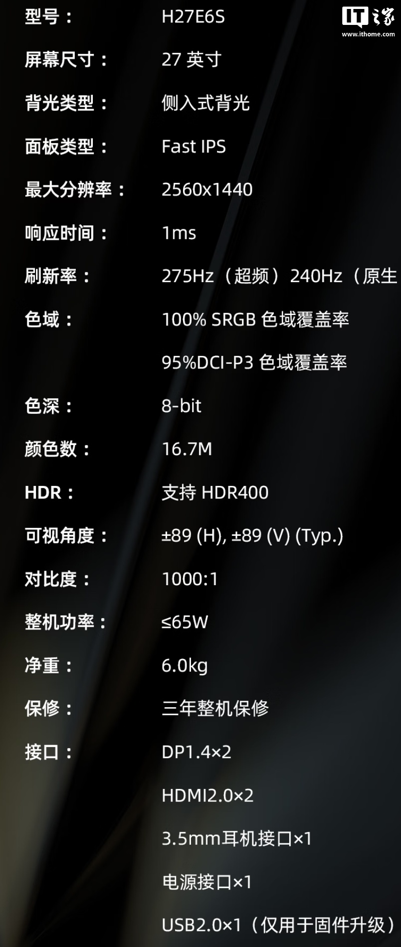 KTC 旗下“H27E6S”27 英寸显示器将于今晚 8 点开启首销,这款显示器主打 2K 275Hz + 内置扬声器,定价为 999 元,部分地区国补后到手价 949 元。