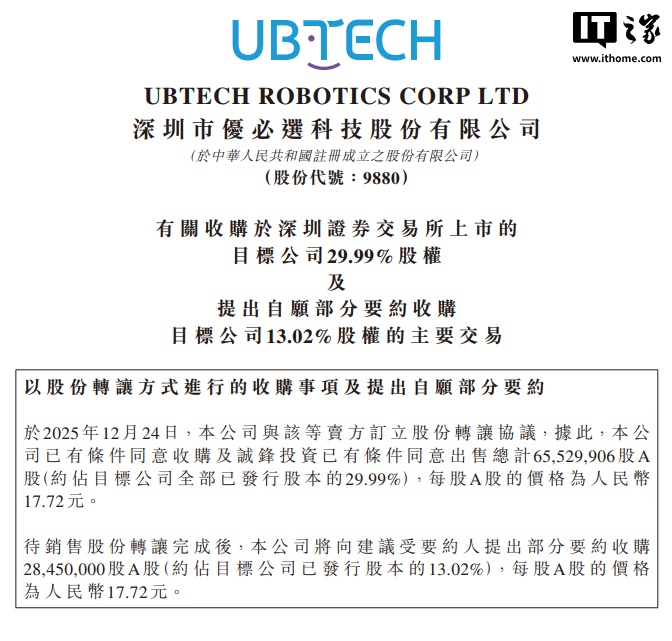 12 月 24 日消息,优必选今晚发布公告,拟以“协议转让 + 要约收购”的组合方式共收购深交所上市公司锋龙股份 9395.75 万股(占锋龙股份公司股份总数 43.01%)。