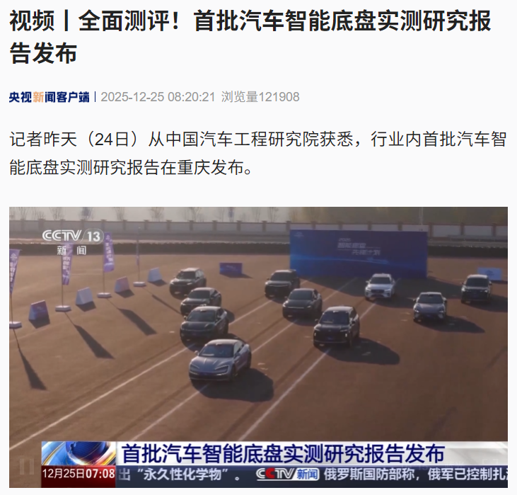 12 月 25 日消息,据央视新闻今日报道,行业内首批汽车智能底盘实测研究报告在重庆发布。