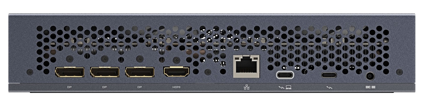 其内置 330W 电源,外部提供一对雷电 5 上下行(注:支持 100W PD-out)、1 个 USB-C 10Gbps、2 个 USB-A 10Gbps、1 个 RJ45 网口、3 个 DisplayPort 2.1b、1 个 HDMI 2.1b。