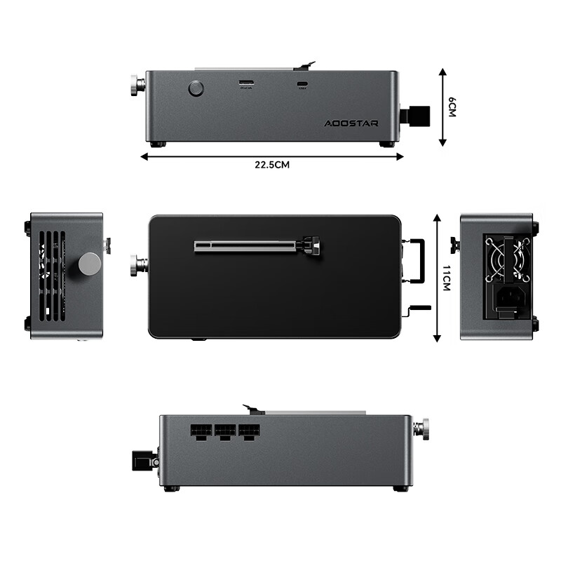 AG03 拥有一根物理上全长的 PCIe 4.0×4 插槽,内置两颗信号放大器芯片;雷电 5 上行接口支持 140W PD-out、雷电 5 下行接口支持 27W PD-out 和 DP 2.1 Alt;其电源预留 150W 冗余,建议搭配功耗<500W 的显卡使用。