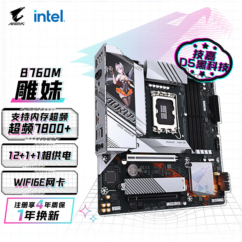 如果你用的还是 12 代-14 代酷睿 i 系列处理器,那么可以选择这款黑白色小板,技嘉 B760M 雕妹主板。听这个名字也能猜到它的外观设计主打年轻消费群体,散热装甲上印有超级可爱的芭蕾装雕妹图案,搭配黑银撞色的涂装,二次元浓度拉满。