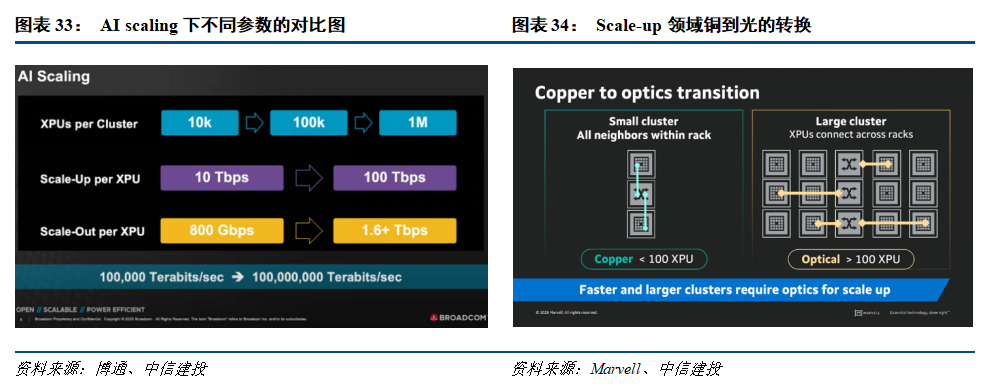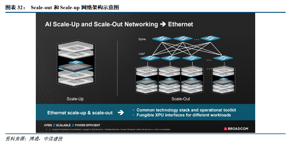 从行业内目前的XPU产品来看,Scale-up带宽显著大于Scale-out。从NV的GPU和各家的ASIC技术参数对比来看,XPU的平均Scale-up带宽为10Tbps,Scale-out带宽为800Gbps,Scale-up对Scale-out的带宽比例为12.5。根据博通CEO Hock的访谈记录来看,公司认为Scale-up的市场空间是Scale-out的5~10倍。中信建投认为,这里指代的是网络硬件,包括交换机、光模块、铜缆和PCB等。因此,网络板块各子领域都有望受益。