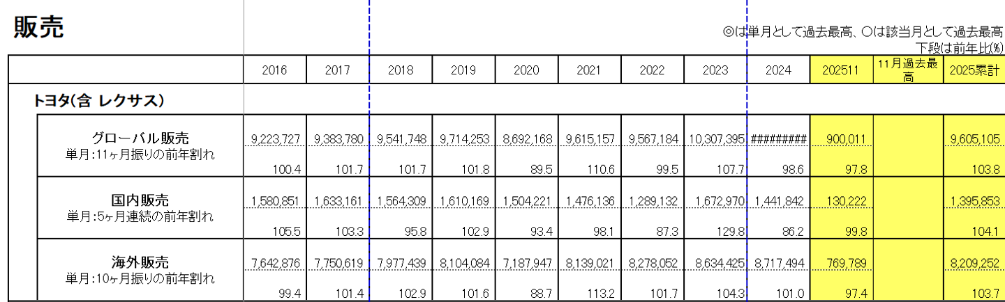 丰田汽车今日公布 2025 年 11 月全球销量(含雷克萨斯)为 900011 辆,同比下降 2%,为 11 个月来首次转为下降。
