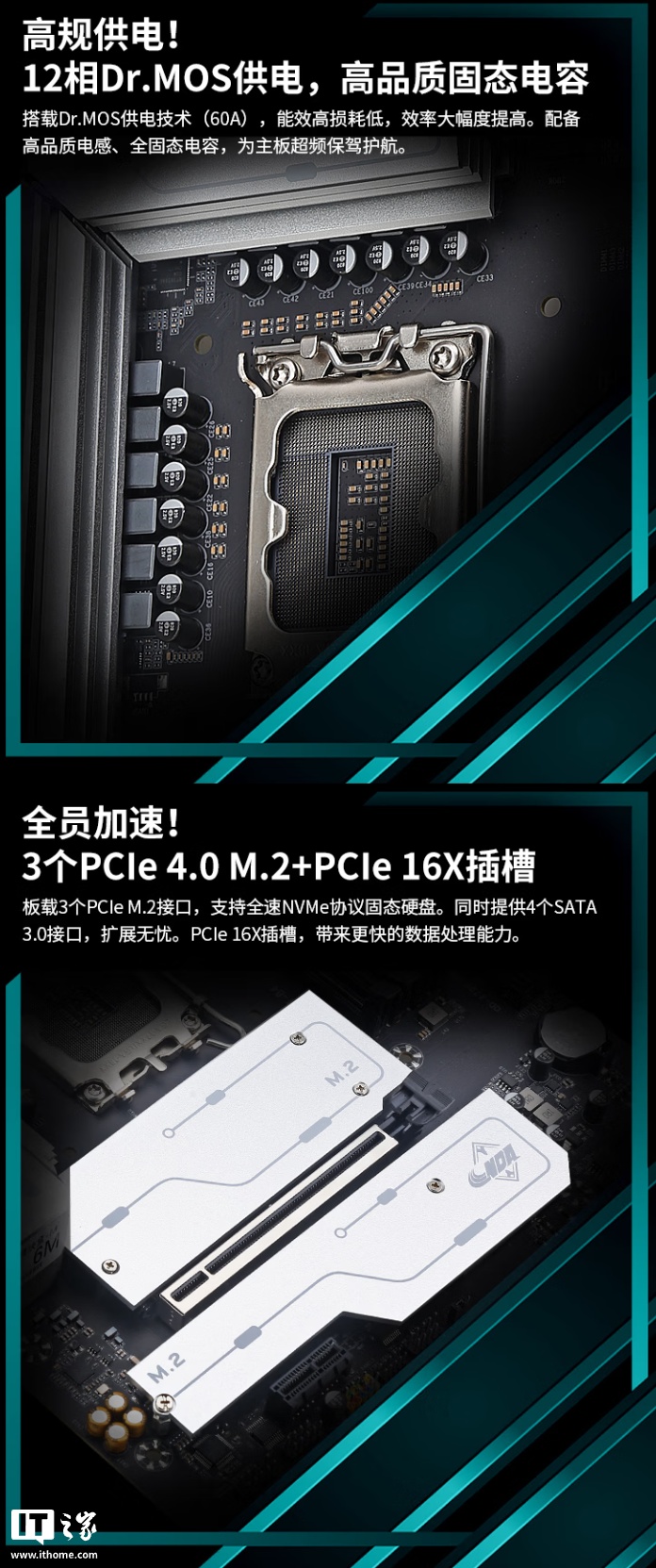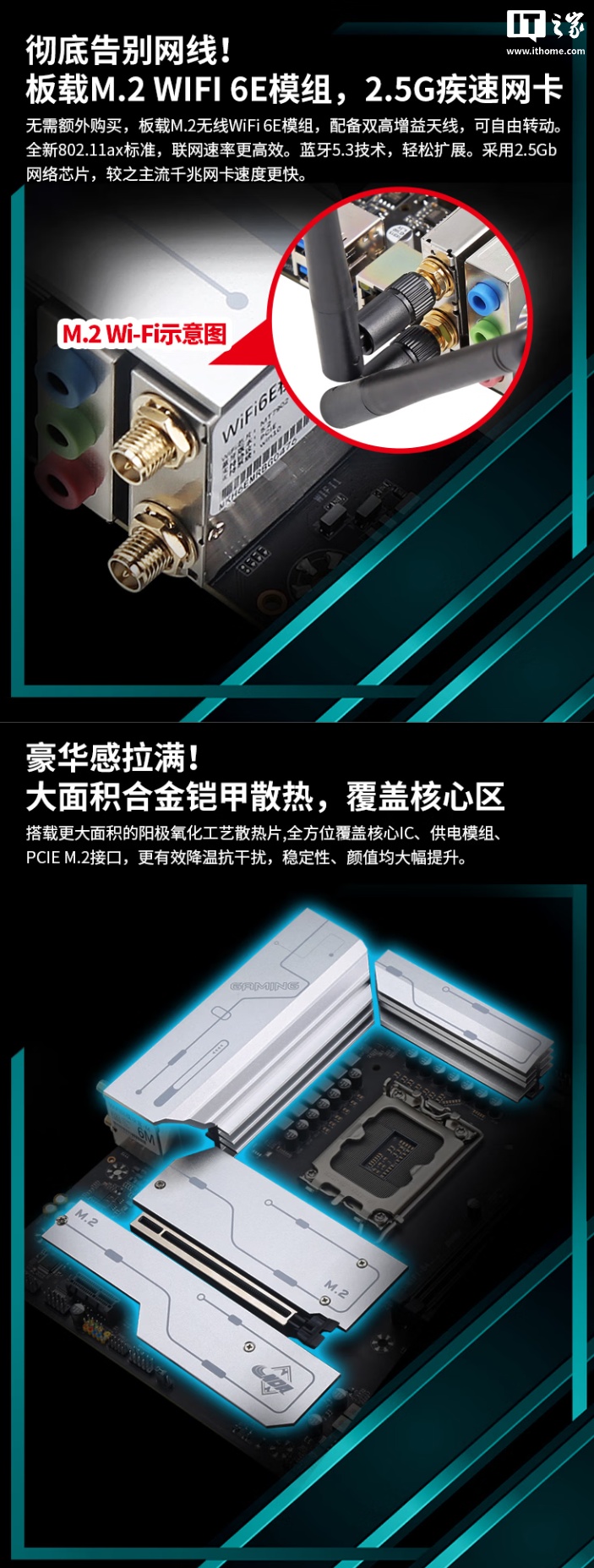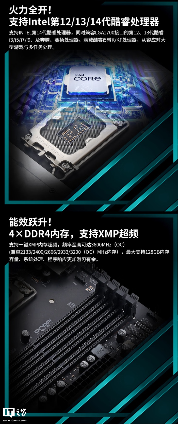 据介绍,这款主板配备阳极氧化工艺散热片,覆盖核心 IC、供电模组、PCIe M.2 接口等,可有效降低温抗干扰,提升稳定性,除酷睿 CPU 外还兼容赛扬、奔腾等处理器,支持一键 XMP 内存超频,频率至高可达 3600MHz(OC)。